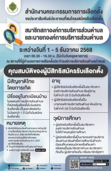 หัวข้อ :: ประชาสัมพันธ์ประชาชนที่สนใจลงสมัครรับเลือกตั้ง "สมาชิกสภาองค์การบริหารส่วนตำบลและนายกองค์การบริหารส่วนตำบล" เปิดรับสมัครระหว่างวันที่ 1-5 ธันวาคม 2568